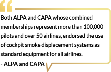 Both the Air Line Pilots Association (ALPA) and the Coalition of Air Line Pilots Association (CAPA) whose combined memberships represent more than 100,000 pilots and over 50 airlines, endorsed the use of cockpit smoke displacement systems (CSDS) as "standard" equipment for all airlines.
